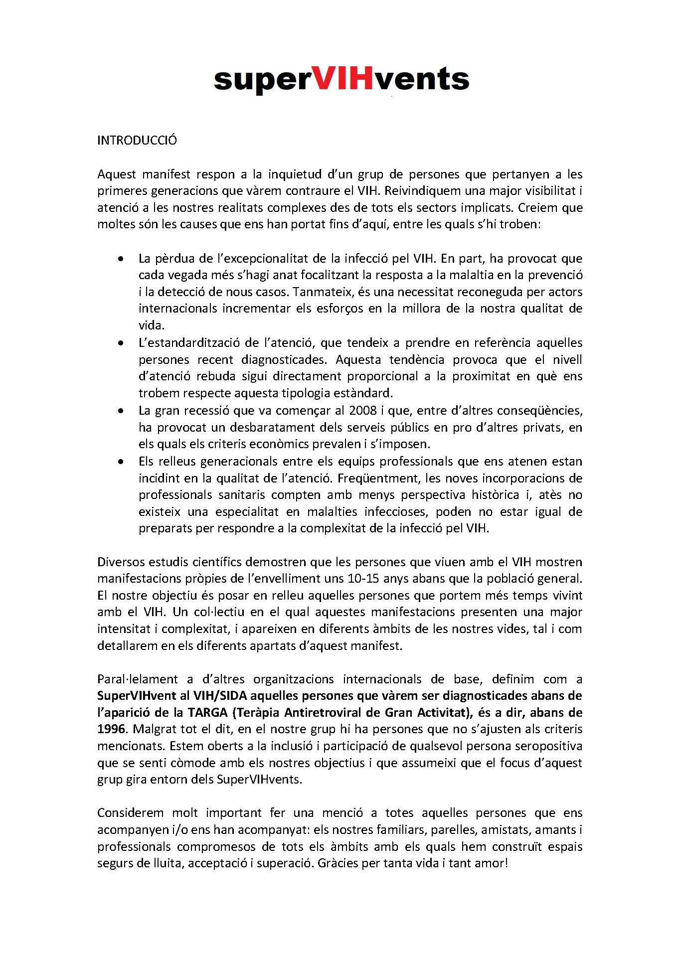Este manifiesto responde a la inquietud de un grupo de personas pertenecientes a las primeras generaciones que contrajimos el VIH y tiene como fin reivindicar una mayor visibilidad y atención a nuestras complejas realidades desde todos los sectores implicados.Fitxa bibliogràfica