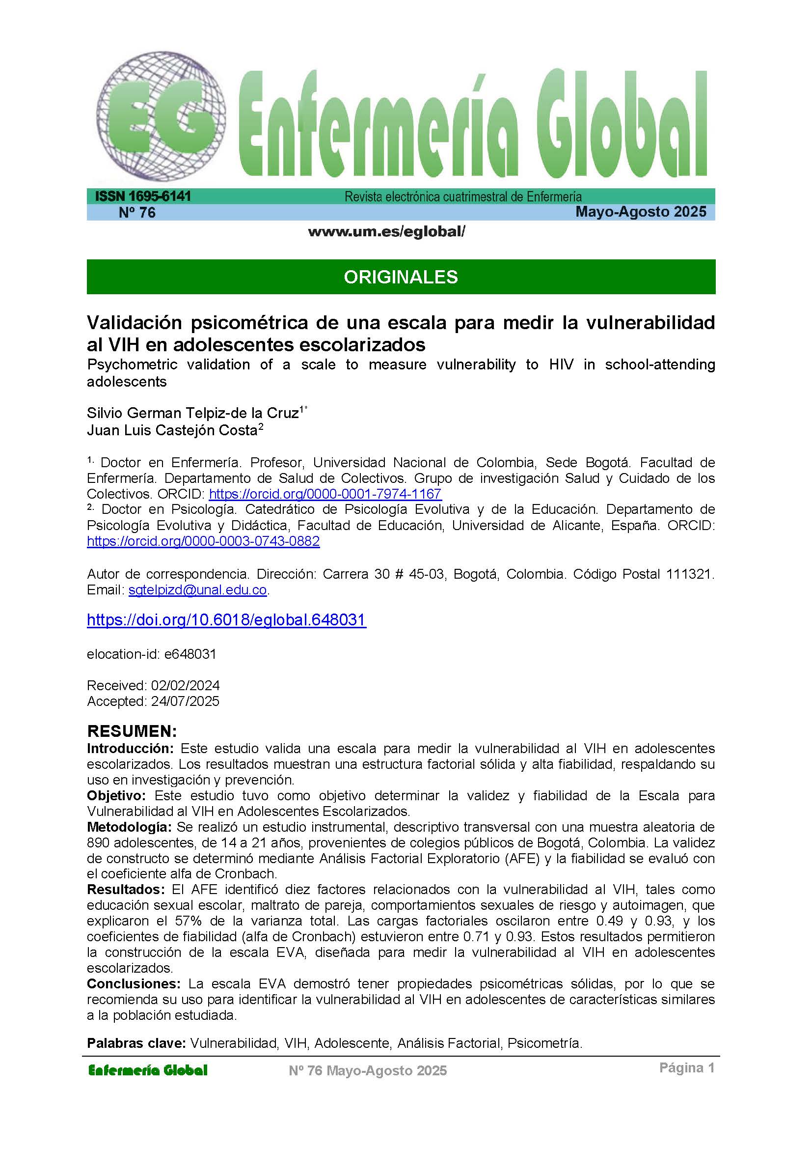 Objetivo: Determinar la influencia de los factores de vulnerabilidad al VIH/sida sobre los comportamientos sexuales de riesgo en los adolescentes. Método: Estudio transversal correlacional predictivo. Muestra aleatoria estratificada de 1000 adolescentes de colegios públicos de una localidad de Bogotá, Colombia. Se estimó un modelo de ecuaciones estructurales que examinó los efectos de los factores vulnerabilidad al VIH/sida sobre los comportamientos sexuales de riesgo (escala EVA-CSR), controlando las variables: consumo de alcohol, número de parejas sexuales, inicio de la vida sexual y edad. Resultados: Sobre los comportamientos sexuales de riesgo el modelo presentó: un ajuste adecuado; explica un 31% de la varianza; reportó efecto directo de educación sexual sanitaria, educación sexual escolar, expresión emocional el colegio, relaciones sexuales por amor a la pareja, maltrato de la pareja, consumo de alcohol, inicio de la vida sexual, número de parejas sexuales; y efecto mediador de la expresión emocional en el colegio, la educación sexual sanitaria y las relaciones sexuales por amor a la pareja. Conclusiones: Los comportamientos sexuales de riesgo del adolescente se explican con cinco factores de vulnerabilidad al VIH/sida y tres variables de control. Los estudios futuros deben centrarse en factores causales y mediadores que fortalezcan la evidencia de causalidad y en intervención sobre comportamientos sexuales de riesgo controlando las variables predictoras.