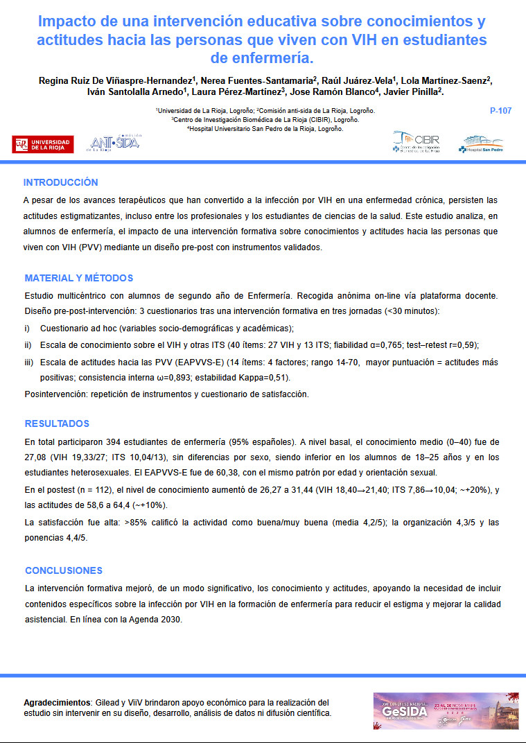 Introducción: A pesar de que el contagio por el VIH en la actualidad se ha convertido en una enfermedad crónica controlada con tratamiento farmacológico para no desarrollar el sida, las actitudes negativas del pasado en torno a la enfermedad continúan arraigadas en el presente y repercuten principalmente en las personas que viven con VIH/sida (PVVS) {Formatting Citation}. En relación con las valoraciones que realizan los estudiantes de enfermería de los pacientes con VIH/sida, existen investigaciones que afirman que está ampliamente documentado a nivel mundial, que suelen ser negativas (Ceylan y Koç, 2021; Liboro et al., 2021; Pickles et al., 2017). El desconocimiento y la existencia de conceptos erróneos sobre la transmisión del VIH no solo fomentan actitudes estigmatizantes y de miedo al contagio, sino que también impactan en las prácticas clínicas relacionadas con el VIH/sida y la calidad de la atención que reciben los pacientes seropositivos (Boakye y Mavhandu-Mudzusi, 2019; González-Pérez et al., 2009; Pickles et al., 2009; Relf et al., 2009). Objetivos: Analizar las actitudes hacia las PVVS en los estudiantes del Grado en Enfermería a través de la escala validada “Actitudes de enfermería ante el sida” (EASE) y la influencia que ejercen los factores sociodemográficos y académicoculturales en las mismas. Metodología: Se realizó un estudio transversal en estudiantes de los cuatro cursos del Grado en Enfermería de cuatro campus universitarios españoles (n=384). Los datos fueron recolectados voluntaria y anónimamente utilizando la escala EASE a través de la plataforma de Google Forms®. Los valores de la escala según las variables sociodemográficas y académico-culturales se examinaron mediante el test de U de Mann-Whitney para las variables de dos categorías y con la prueba de H de Kruskal- Wallis para las variables de más de dos categorías en la que se realizaron las comparaciones múltiples post hoc mediante la corrección de Bonferroni para determinar si existía la asociación de significación estadística. Para determinar la magnitud de asociación entre los factores estudiados y los resultados de la escala EASE obtenidos, se optó por una regresión lineal múltiple en la que se incluyeron las variables dicotomizadas sexo, pareja, orientación sexual, creencias religiosas y curso académico. Dado que el curso académico no pudo dicotomizarse, se crearon 3 variables dummies tomando como referencia el primer curso. Resultados: Por lo general, las actitudes hacia el VIH/sida son relativamente positivas con un valor medio total de la escala EASE de 85.25 ± 9.80. En ella, las mujeres, las personas sin pareja y las no heterosexuales presentan actitudes más positivas sin significación estadística. Se observan diferencias significativas por curso académico (p=0.041), por creencia religiosa (p=0.0001) y al desglosar por ítems la escala EASE en muchos de estos. Al ajustar todas las variables en la regresión lineal múltiple, solo se mantiene la asociación con las creencias religiosas (p = 0.045). Conclusiones: La actitud empática hacia las PVVS, que debería ser innata en la profesión enfermera, se debe fomentar, en primera instancia, en el ámbito universitario del Grado en Enfermería (Pickles et al., 2019). Las creencias religiosas y su relación con el estigma hacia el VIH/sida forman parte de los componentes culturales que pueden estar asociados al propio estigma, prejuicio o discriminación hacia las PVVS e incluso con otros grupos vulnerables de marginalidad (Bos et al., 2013; Fuster-Ruiz de Apodaca et al., 2018; Pryor y Reeder, 2011). No obstante, las organizaciones basadas en la fe pueden servir como estrategia para erradicar la discriminación y los estigmas ante el VIH/sida en su comunidad religiosa (Bluthenthal et al., 2012).