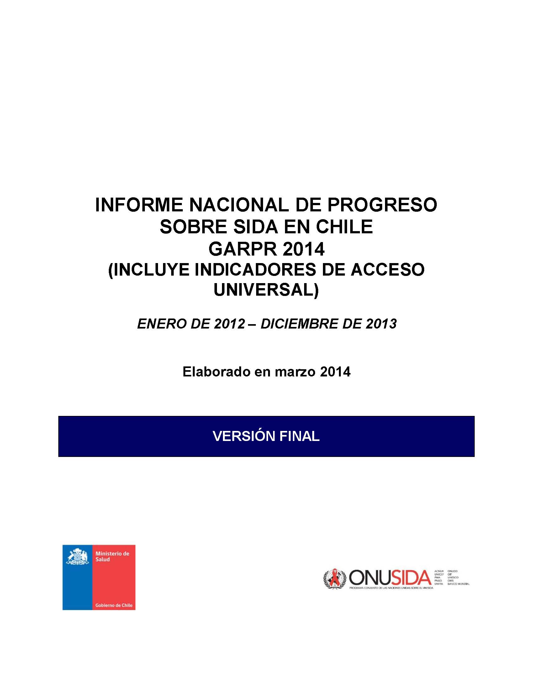 Este documento corresponde al Informe Nacional de Progreso sobre SIDA en Chile, GARPR 2014; elaborado por el Programa Nacional de Prevención y Control del VIH/SIDA e ITS del Ministerio de Salud, con el apoyo de consultores externos contratados por ONUSIDA, de acuerdo a las Directrices para el Desarrollo de Indicadores Básicos.
